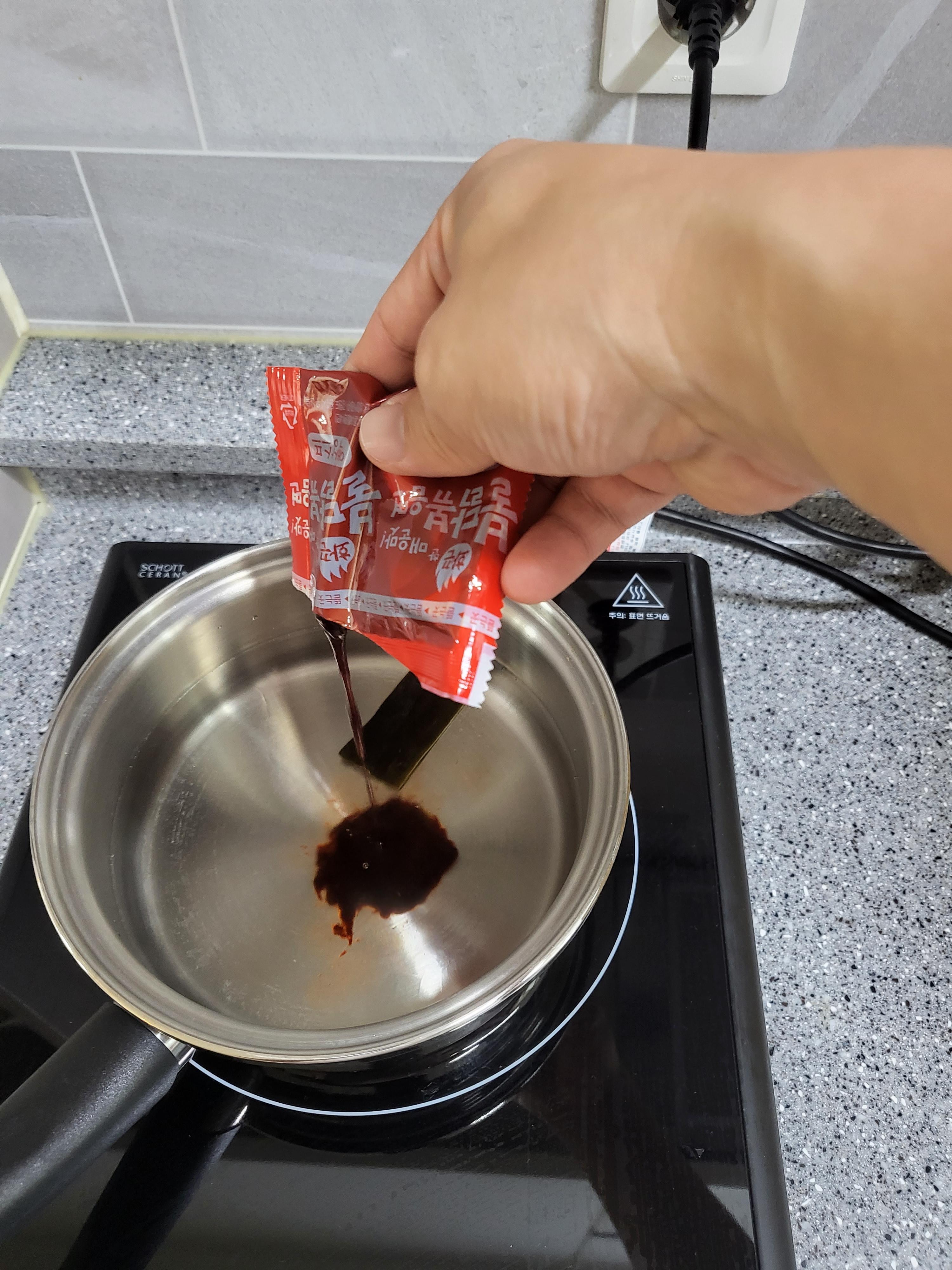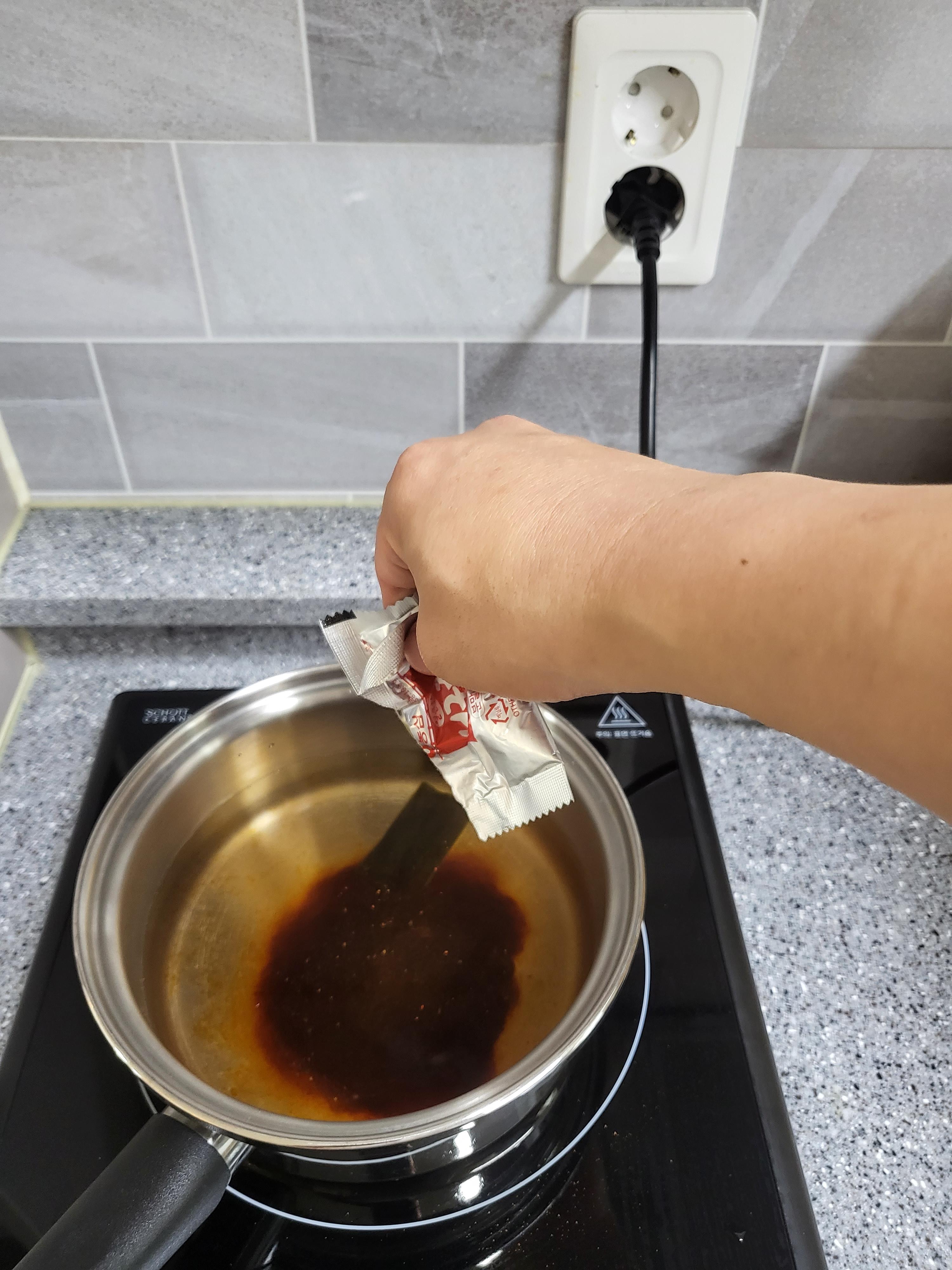 Before the water boils, add the roasted chicken noodle liquid sauce, half of the neoguri soup, and the seasoned soup, and wait for the water to boil. And adding the neoguri's kelp is optional, so you can do whatever you want. But I put it in and boiled it so that the broth came out.