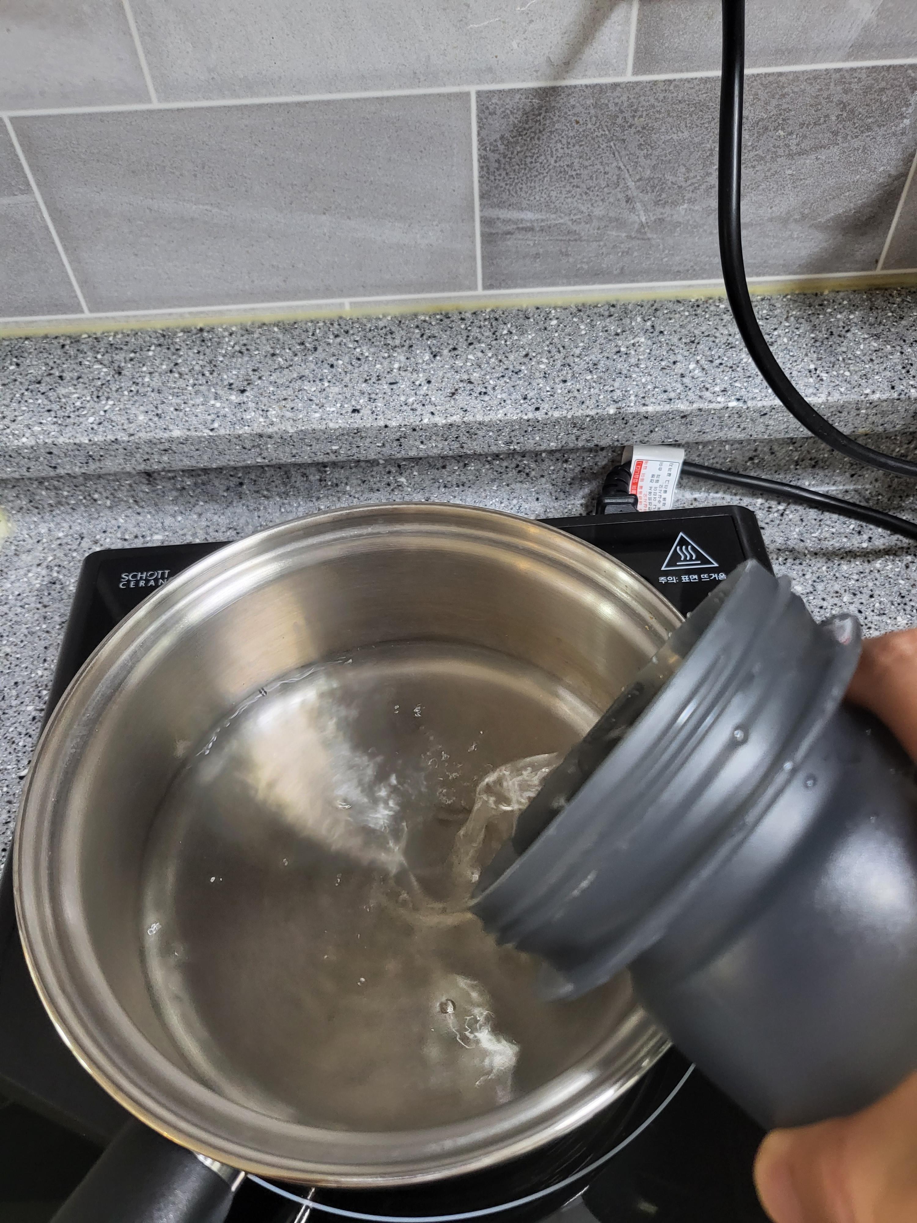 To boil ramen noodles, put about 650ml~680ml of water in a pot and bring to a boil. (I used a tumbler's scale to adjust the amount of water.)